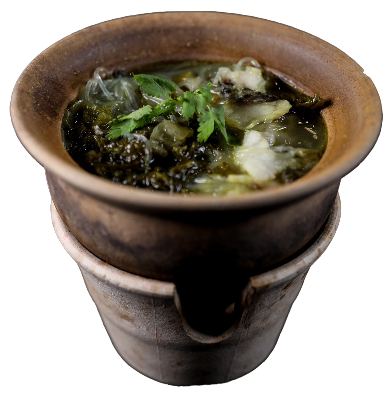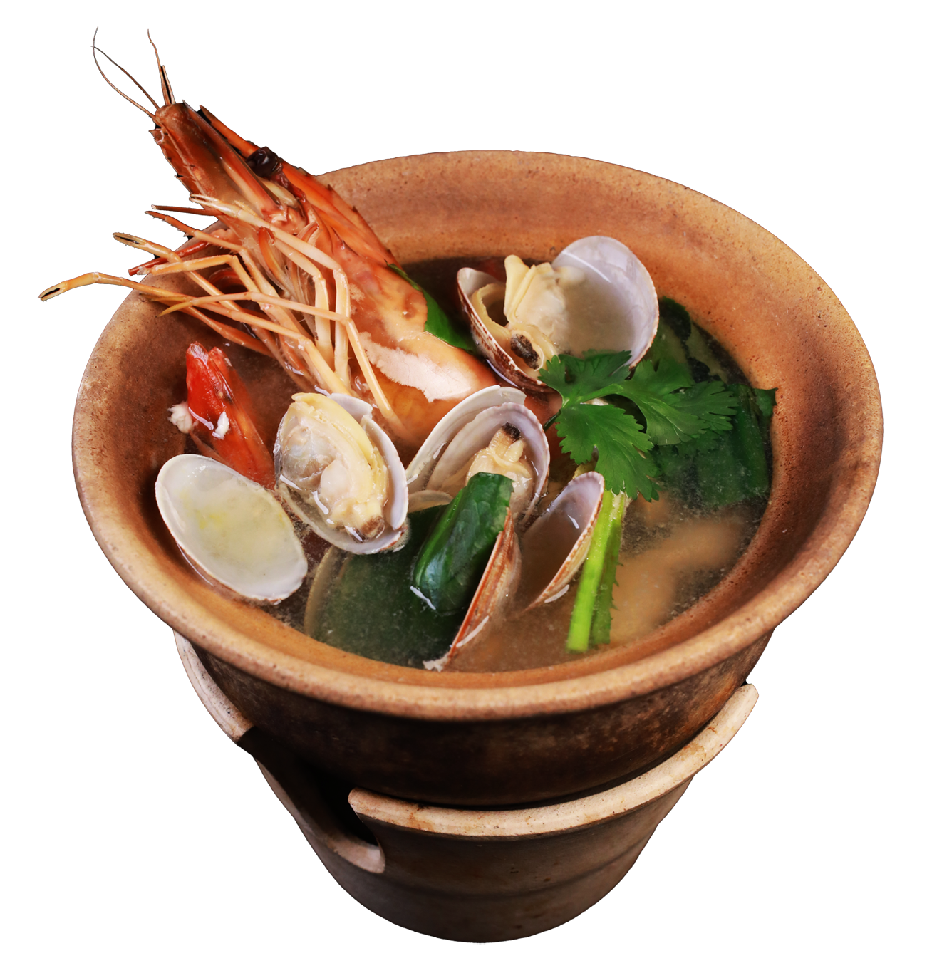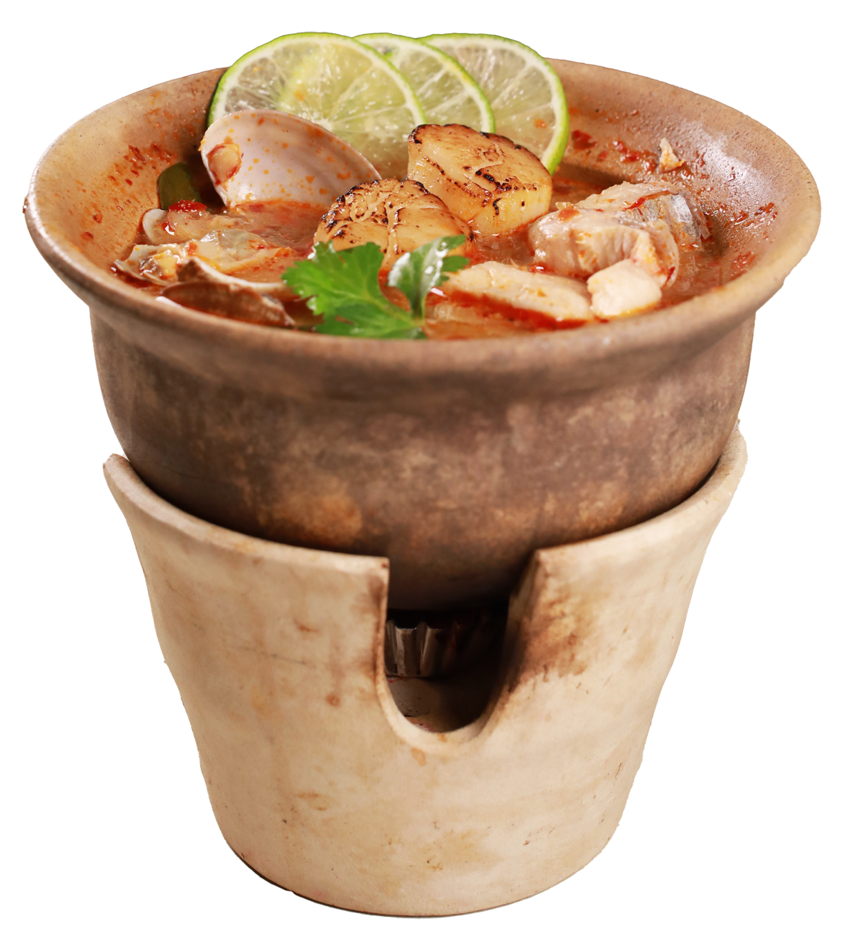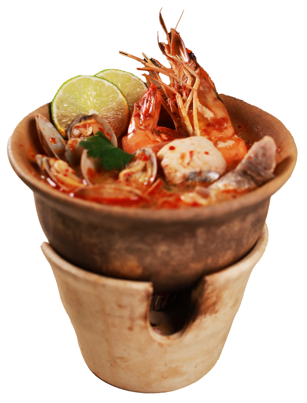 Classic TomYum Soup. But we made it better! Served in a traditional Clavoot on top of a burning