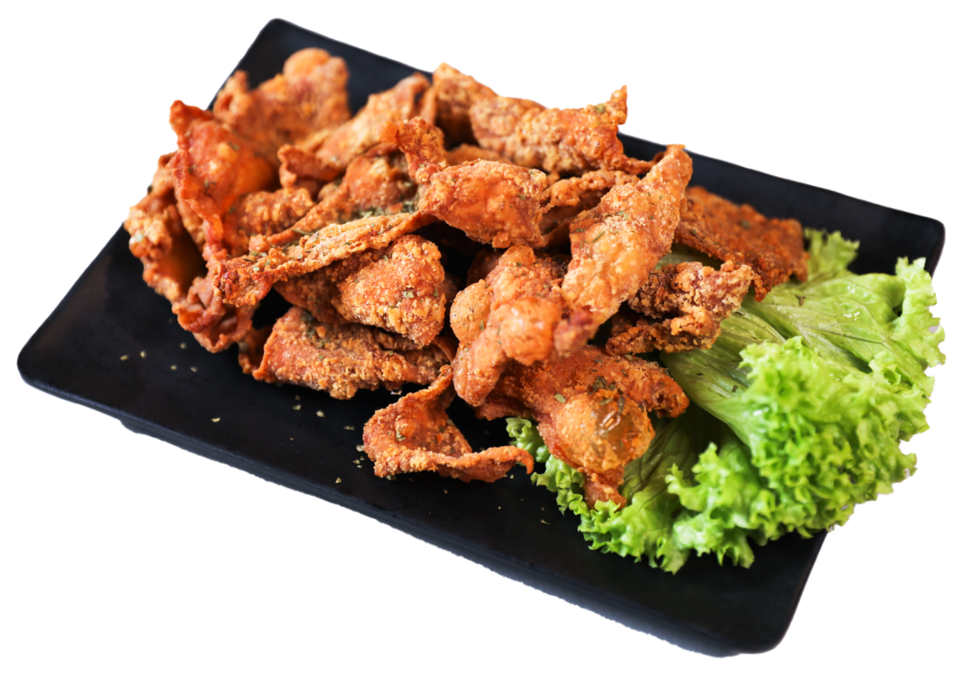 Freshly-prepared deep fried chicken skin that's simply irresistible. A must have in our restaurant and it goes very well with our beers. Marinated with our Top Secret signature spices. Every piece of skin fats is removed piece by piece. Great for addiction.