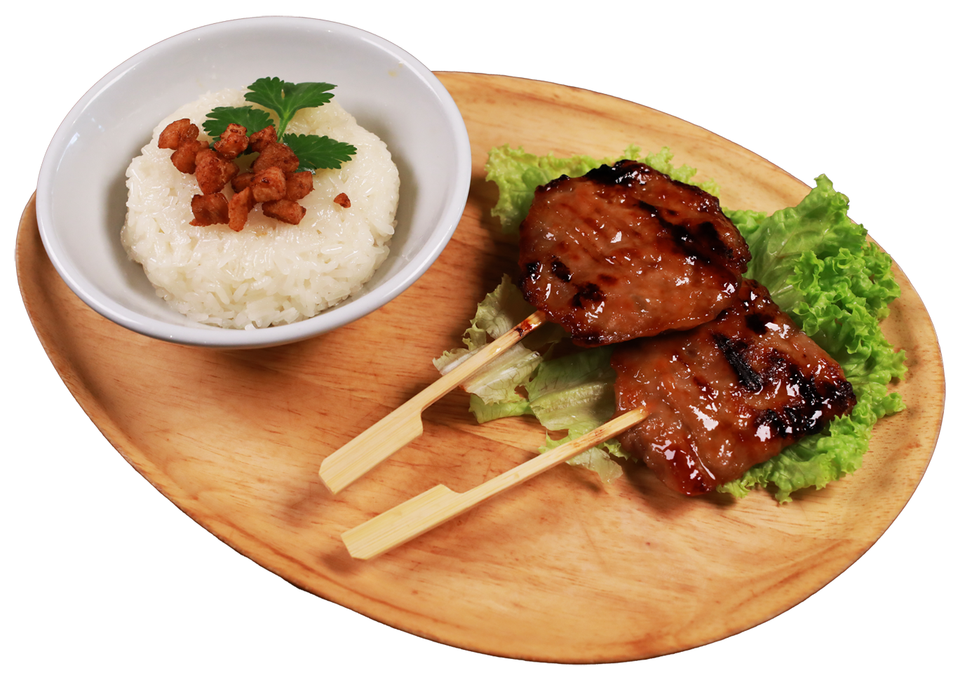 BEST-SELLING Daddv Moo Ping! No one does it like we do. These popular Pork Skewers are freshlv cooked on a grill. Take a bite and vou'll understand why these mouthwatering Thai Skewers are such