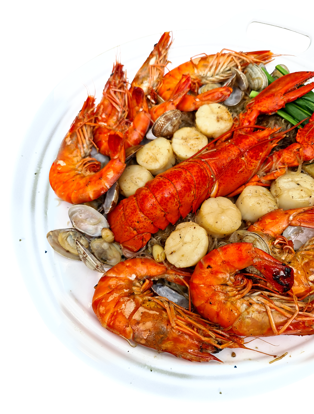 Suitable for 5-6pax. 700gm+/- Indo Mudcrab, 8pcs Jumbo Scallop, 8pcs King Tiger Prawn, half a kg of Korean LaLa Clams.